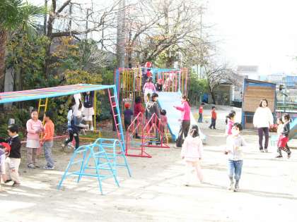 お弁当の後は園庭で遊びました。長い滑り台に列ができました。築山登りに挑戦しました。