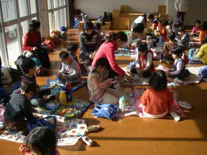 交流遊びのあと待賢幼稚園の2階遊戯室でみんなで集まってお弁当を食べました。日の光がが入ってきて温かい中でお母さんの手作りお弁当に「いただきます」