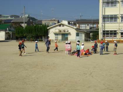隣りの翔鸞小学校は全校遠足でお出かけでした。そこで幼稚園の遊び場を小学校の運動場にしました。