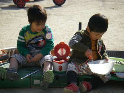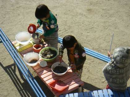 「これは僕が作ったんや」ボールに泥や水や粘土やドングリなどを入れて「コネコネ」とかき混ぜていました。ボールを手で抱えたり台に置いたりしておたまで何度も何度もかき混ぜて楽しそうです。炊飯器にもドングリを入れて2人でいつまでも遊んでいました。そのうちに,1人が,「どんぐりころころ どんぐりこ おじけに♪・・」と歌いだしました。