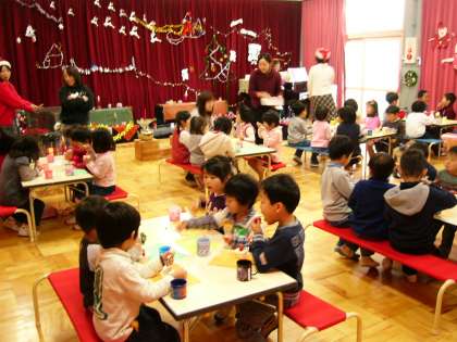 プディ・プリエさんが翔鸞幼稚園用に特別に作ってくれたオリジナルのかわいい美味しいケーキをみんなでいただきました。「いただきます」「おいしいね」