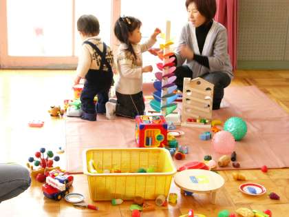 冬休みが明けて久しぶりの出会いです。お母さんと一緒に広い場所でおもちゃで遊べて楽しいね。子ども同士自然に同じような遊びになるんですね。長椅子を押して自動車ごっこでしょうか。