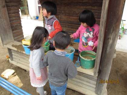 しょうらん幼稚園にはジャングルジムの周りに遊びやすいコーナーがあります。砂場や小屋や,それから何とゾウさんがいるんですよ。このゾウさんの周りでもままごとセットを持ってきて遊んでいますね。