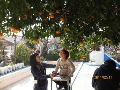 今日は少し日が射していました。友だちと遊んだり飼育のお手伝いをしたりしました。幼稚園に夏ミカンの木があります。今年は特にたくさん実りました。今日は一人一人収穫しました。「どれにしようかな」「どれも大きいね」とてもたくさんですね。