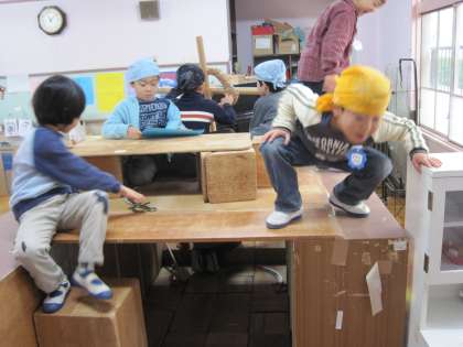 「ここは船長室。これはかじ」「ダンボールで作ったんやで」「早く乗ってください。海賊船出発します」 子どもたちみんなバンダナを頭に巻いて一致団結。エイエイオー。
