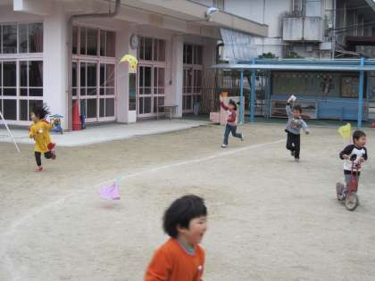 「凧持ってて。はいっ,ていったら放してな」「私のも」「糸がこんなに絡まった。先生,直して」・・・園庭では狭いので,隣の小学校へ。「教頭先生,運動場が空いている時,凧揚げていいですか?」「はいいいですよ。どうぞどうぞ」と今度は小学校の広い運動場で思いっきり走っての凧揚げです。「よーい,どん」 高く上がるね。