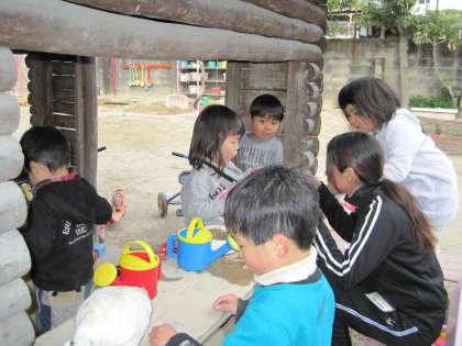 一緒に砂遊びや遊具で遊んだり,かるたをしたり,お弁当も食べて1日一緒に