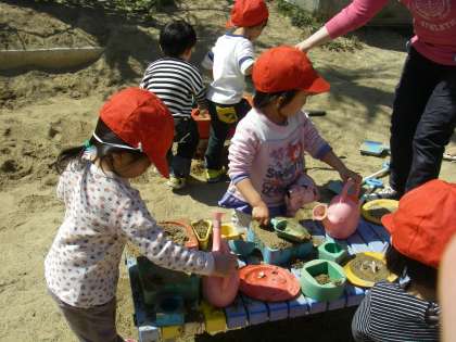 年少組さんは砂遊びです。同じ時間同じことをして空間を共有して安心します。