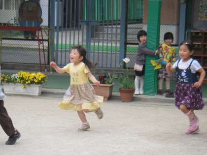 子ども達は幼稚園へ来ると,友だちと遊ぶ楽しさが寂しさも嫌だなあと思っていたことも忘れてしまうのでしょう。ジャングルジムや滑り台に向かって走って行く登園後の様子です。
