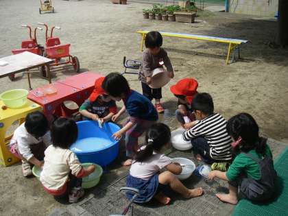 年少組さんは色水遊びをしました。友だちがたくさん寄ってきました。「今お日様が出てきたな」「夕涼み会でもこれしような」子ども同士で語りながら遊んでいました。