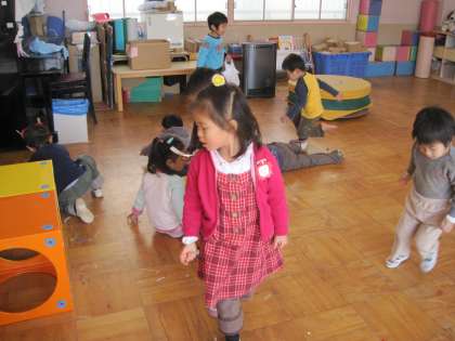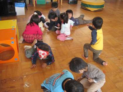 床一面に出して遊んでいたドングリを集めます。「よーい,どん」「はやいはやい」床のドングリがどんどん片付けられていきます。「集めたドングリはこちらの篭に入れます」