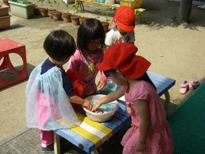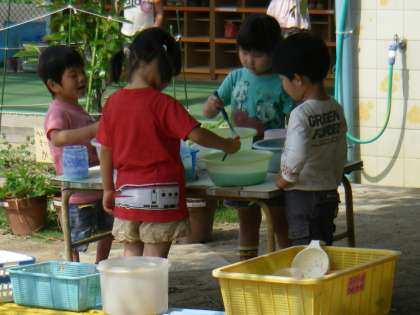 午前中の早い時間に,年少組さんは部屋の前で色水遊びをしました。年中組さんはその隣の木の下でやはり色水遊びをしています。時々相手の遊びを見に行ったりしているようです。