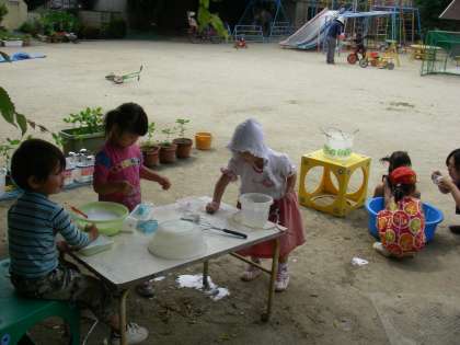 今日みたいな夏日には,「色水遊びが気持ちいいね」「私もする」木陰でゆったりと遊びました。