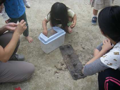 「何を見ているのですか?」と聞くと,年少組さんの子たちが言いました。「ナメクジ」「あのね,わたしナメクジさわれた」「えー,ナメクジにさわったの? すごいね」