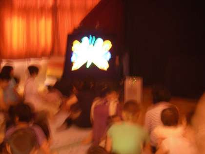 ロングまき紙芝居,マジック,人形劇にブラックライトのはらぺこアオムシのお話でした。「何も入っていない箱から・・」「すごい。小さな箱が出てきた」「また・・」
