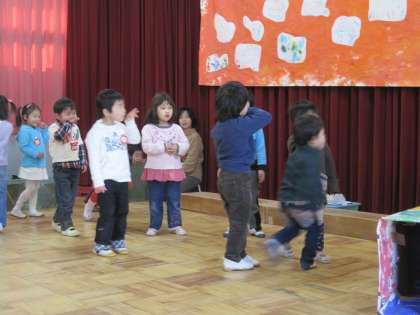 年少さんです。大勢のお客さんの前で歌ったりなりきって遊ぶ「ごっこあそび」を見てもらいました。4月にはみんなの前に出られなかった子や泣いていた子も,どの子もみんなが集団の中で自分を一杯出していました。リズムや歌も楽しんでいましたね。また一段成長しました。