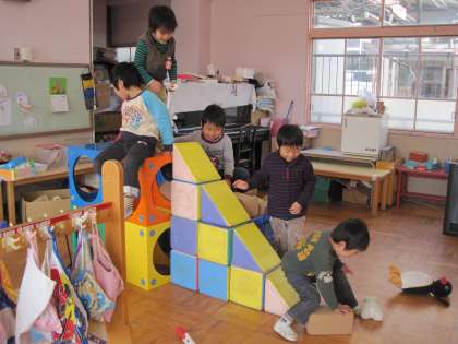 ゲームボックスを積み上げた上にのって遊ぶのがおもしろい子どもたち。きょうは,Aちゃんがそれに積木を組み合わせて滑り台みたいになりました。「Aちゃんは大工さんみたいやな」と言うと「僕 作り屋さんやで」とAちゃん。すべるのが楽しくて「順番やで」「すべれた」「電車もすべらせてみよう」「後ろ向き」と言いながら遊んでいました。