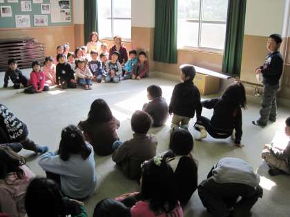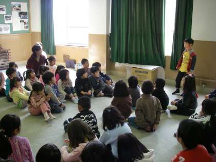 「お願いします」と挨拶した後,遊びました。去年卒園した先輩が立派に司会をしたり導いてくれたりしているのを見て,とても頼もしく思いました。