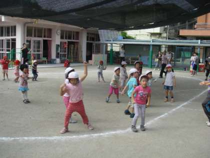 音楽に合わせて体操をしています。ラジオ体操のこどもバージョンです。