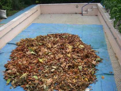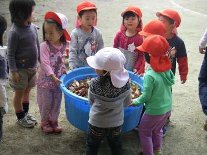 公園から年少組さんが落ち葉を拾ってきました。一日お部屋の前に干して,今日はみんなの落ち葉と合流してプールで乾燥の続きです。