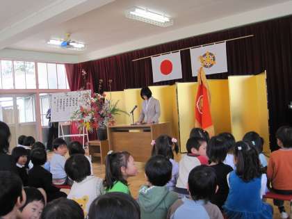 新入園児年少13名、年中3名を真ん中にして,にじ組(年中)そら組(年長)が横に並び全園児44名で入園式の開始です。園長先生,PTA会長さんとお辞儀をした後,座ってお祝いのことばを聞きました。