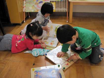 部屋で遊んでいます。絵本を見たり,おもちゃで遊んだり,交通地図で自動車ごっこをしたりしました。