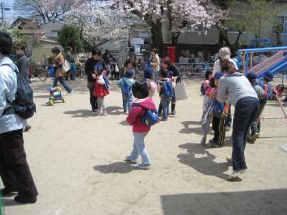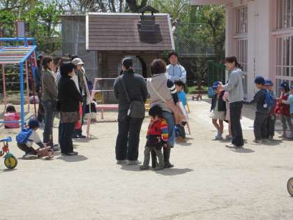 さようならをした後,また遊び直しの子も,子どもたちはよく遊びます。お母さんお父さんは待つ間,子どもを見守りながら他の保護者と交流です。