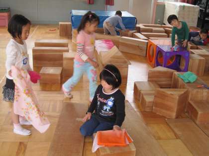 年長組は海賊船作りに一所懸命です。積み木をいろいろと並べて海賊船のイメージをはっきりさせています。去年の年長さんのイメージがよほど強く残っているようです。「自分たちもあんな風にやってみたい」と思わせる去年の年長さん。よい伝統を残してくれました