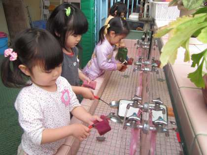 にじ組さんになって初めて絵の具遊びをしました。色々な形の型やローラーを使って遊んでいると「なんか元の色と違うなあ・・・」と色が変わることを喜んでいました。絵の具が乾いて、手がカピカピになるほどたくさん遊んでいる子もいました。遊んだ後も、トレーや型ををきれいに洗ってくれました。さすがにじ組さん!またいっぱい遊ぼうね。