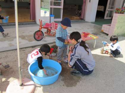 今日は28度を超える暑さでした。水が恋しくて早速水遊びが始まりました。