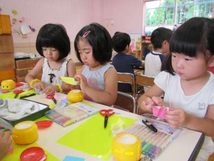 幼稚園の大きな笹に飾りを飾りました。子どもたちより何倍もある大笹。あまりに大きいので、ゲームボックスにのってこよりを結びました。みんなの願いがかなうといいですね。