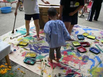 「絵の具をしてるの」大きな筆で「ドシン,ズズー」と線を引きました。
