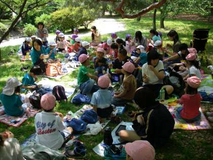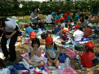 10時半頃から「お弁当はまだ?」と言っていましたが,遊んでいるうちに11時半頃になりお弁当になりました。4園で交じって食べようと固まって食べました。