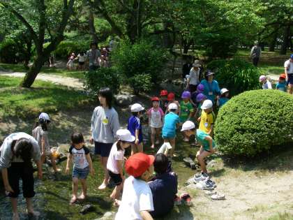出水の小川で水遊びをしました。Tシャツとパンツになって裸足でジャブジャブ水遊びです。水をかけ合ったり橋の下をくぐったりして遊びました。園から持って行っていたタオルで足を拭きました。