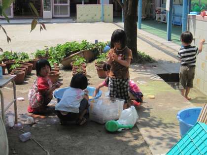 いいお天気の暑い日は水遊びが気持ちいい。いろいろな色のジュースをつくってカップに入れて遊びました。おいしそうなのがいっぱいできました。でも,中にはいろいろなジュースがまじって………。また,遊びたいね!!