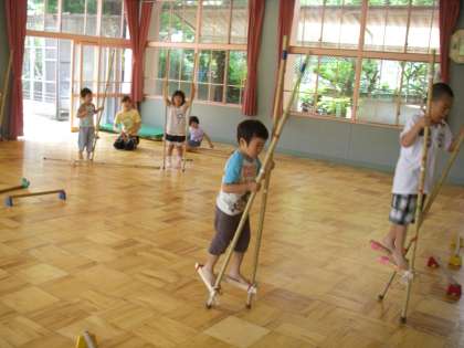 年長さんが竹馬を粘り強く続けています。「先生見て。乗れたよ」「よかったね。がんばっているね」