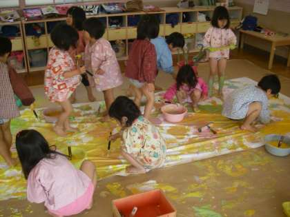 年少組さんが絵の具遊びをしました。2畳余りもある大きな紙の上で,春を思わせるような明るい色です。筆で描いたり足や手で型をつけたり,色を混ぜてぬたくったり滑って転んだり遊んでいます。「先生,白をくださーい」「先生,もっと黄色が欲しい」