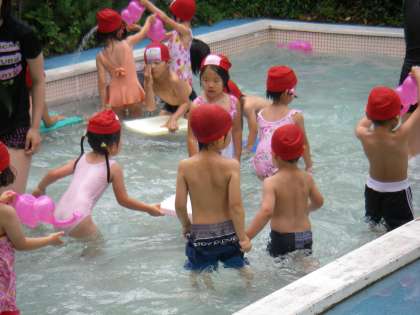 今日も朝から蒸し暑い日です。にじ組さんプールです。イルカ泳ぎですよ。「ザブーン」 すっきりしましたね。