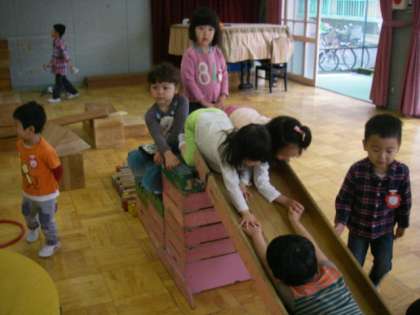 遊戯室にある大きな積み木を使って遊んでいます。だんだん大きくなっていきます。だんだん広がっていきます。そら組さんだけでなく、にじ組さんも入って遊んでいます。