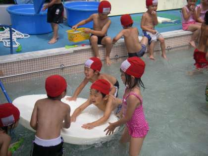 にじ組のプールです。今日はビート板運びをしました。どのグループがいくつ勘定するまでにプールの端まで行けるか。「ヨーイ,ドン。いーち,にーい,・・・