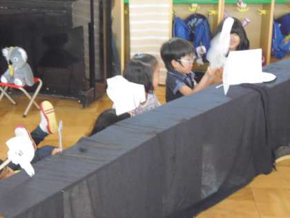 そら組さんの子どもたちが午前中,ペープサートを作っていました。お弁当が終わってから,職員室に「一時になったら,ペープサートを始めます。絶対に見に来てください。」とPRにやってきました。1時になって,お部屋に行ってみると,椅子が用意されています。ひかりさんもにじさんも集まってきました。まず初めは,「グーチョキパーで何作ろう」と歌い始め,みんなでゲームです。そのあとは,いよいよペープサートです。始まった途端,電話が入り,せっかくのお話を聞くことができませんでした。残念。でも遊びがどんどん膨らんで,発表会まで持っていく企画力と演技力はカンヌものです。