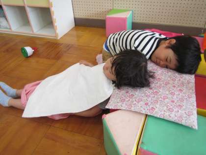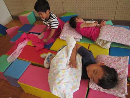 年少組のお部屋では,みんなでままごとをしています。今日は,積み木で広いベッドをつくりました。布団を用意して,好きなところで寝ます。みんなで「おやすみなさーい!」友達と一緒,うれしいね!