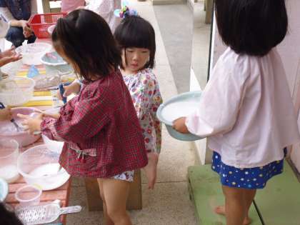 先日から、そら組さんでは、石鹸を使ったあそびを始めました。石鹸をおろし金で細かく削り、水で溶かします。そのあと、一生懸命泡立てます。フワフワした泡やきめの細かい泡ができてきます。まるでケーキを作っているかのようです。出来上がった泡をいろいろな容器に詰めて、接待してくれます。「ちょっと大人向きのコーヒーにしました。」「今度はプリン味のジュースです。」しばらくすると、にじさんの女の子も仲間に入りました。教えたり教えてもらったり、時には注意されたり。とてもいい関係です。