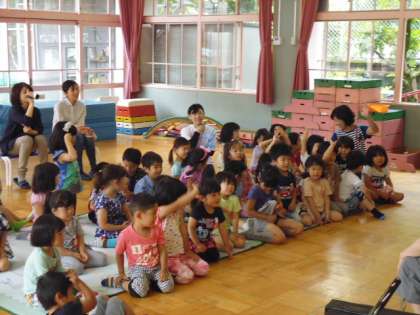 今月お誕生日を迎えたのは,園児で4人と先生で1人でした。メタルと絵本をプレゼントしてもらっていました。フロアの友達からは,お誕生日をお祝いする歌をプレゼント。「好きな食べ物はなんですか?」「好きな遊びはなんですか?」「好きな動物は何ですか?」と質問が出ました。お誕生日を迎えた5人からそれぞれ答えが返ってきました。最後は,先生からの楽しいお話がありました。魚が次々にいろんなものを食べて,最後にはクジラになってしまうのです。みんなも好き嫌いせずに大きくなってくださいね。