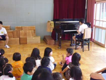中学生のチャレンジ体験も今日で五日目、最終日です。朝、園児みんなが遊戯室に集まりました。3人のお兄さんたちから、紙芝居やピアノ演奏のプレゼントです。声色を変えてお話ししてくれたり、「おかあさんといっしょ」に出てくる曲を弾いてくれました。知っている子どもたちからは歌声が聞こえてきました。