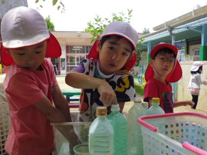 各クラスとも子どもたちは、いろいろな遊びにチャレンジしています。ただ淡々と遊んでいるのではなく、そこには思考する活動が盛り込まれています。描きたいものを思い切り、色はどうする。泡を立てて色を付けて水を混ぜて、器に入れてお店屋さん。どんな言葉でお客さんに声をかけようかな。そら組さんは、年下のお友達にわかりやすくお話しします。忍者ごっこやおばけやしきづくりなどなど毎日が楽しいです。