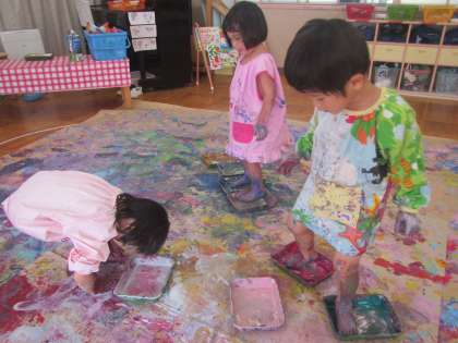 年少組が,絵の具遊びをしました。昨日から楽しみにしていた子どもたち。自分の好きな色の絵の具を大きな紙にぬりぬりしていくと・・・「なんか,紫になってきたよ」「オバケみたい!」と初めての絵の具に大興奮!色が変わっていく様子や絵の具の感触を手と足で感じていました。