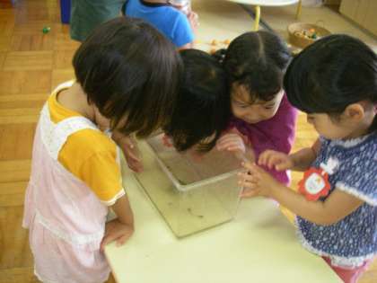 「かわいいなあ」「しっぼをぷりぷり振ってる」ひかり組の子どもたちは、水槽を覗き込んでいます。