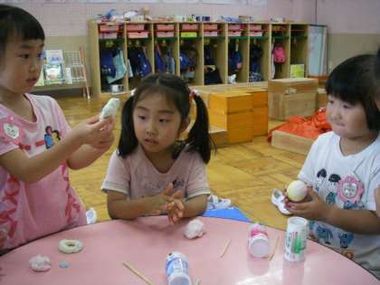 にじ組さんは、紙粘土であそんでいます。コネコネ、コネコネ。色を付けたり、ビーズをつけたりしてキャンデーや飴を作っています。お友だちが作ったものに刺激を受けて、想像力がアップします。「先生、紙粘土、ちょうだい」どんどん作品が出来上がります。