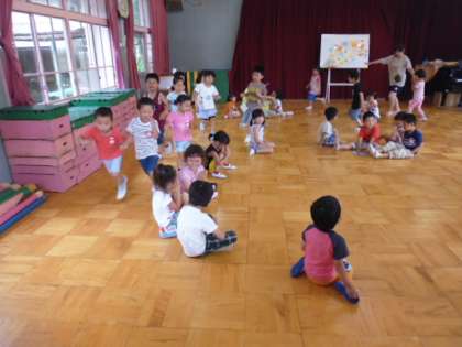 昨日は小笹をおうちに持って帰っていただきました。遊戯室前には大笹が飾ってあります。そして今日は「七夕の節句」です。全員遊戯室に集まって集いました。先生から、彦星さんと織姫さんのお話を聞き、「ささのは さらさら〜」と歌いました。大きな輪を作りました。輪の外を流れ星さんが回ります。タッチされたお友だちがさらに流れ星に。どんどん増えていきます。